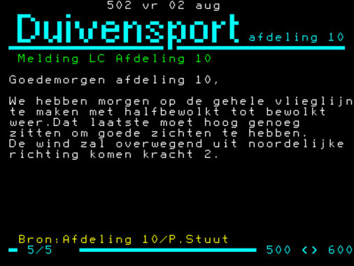 Voor komend weekend staat voor de jonge duiven Dreis Bruck (320 km) op het programma en voor de Natoer Kalkar ( 145 km). Voor de Natoer vluchten