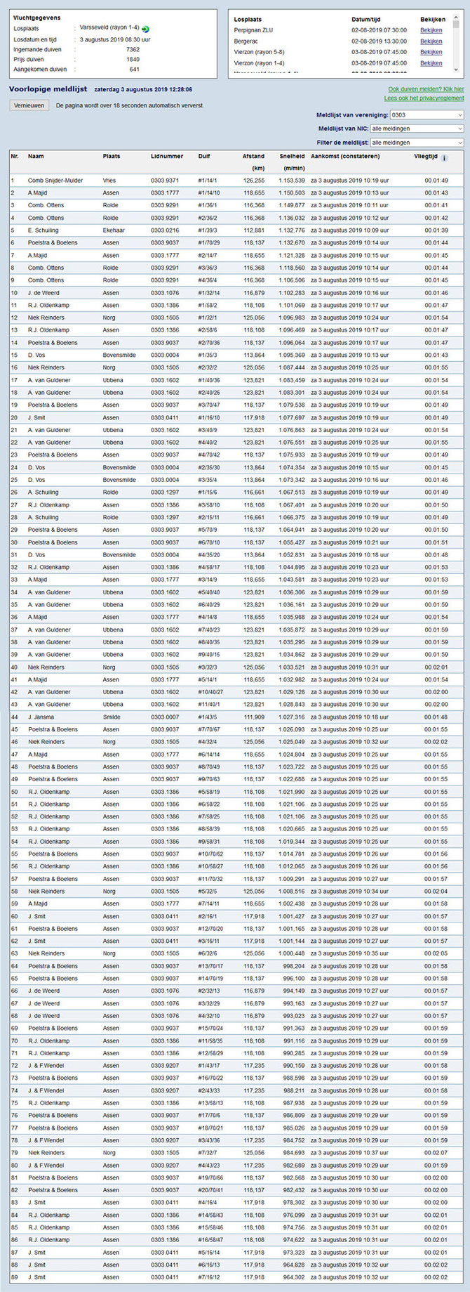 De 1e duif viel dus bij de Comb Snijder Mulder om 10.19.27 u met een snelheid van 1153,539 m/min. De laatste prijsduif viel om 10.31.34 u bij Jan Kamminga met