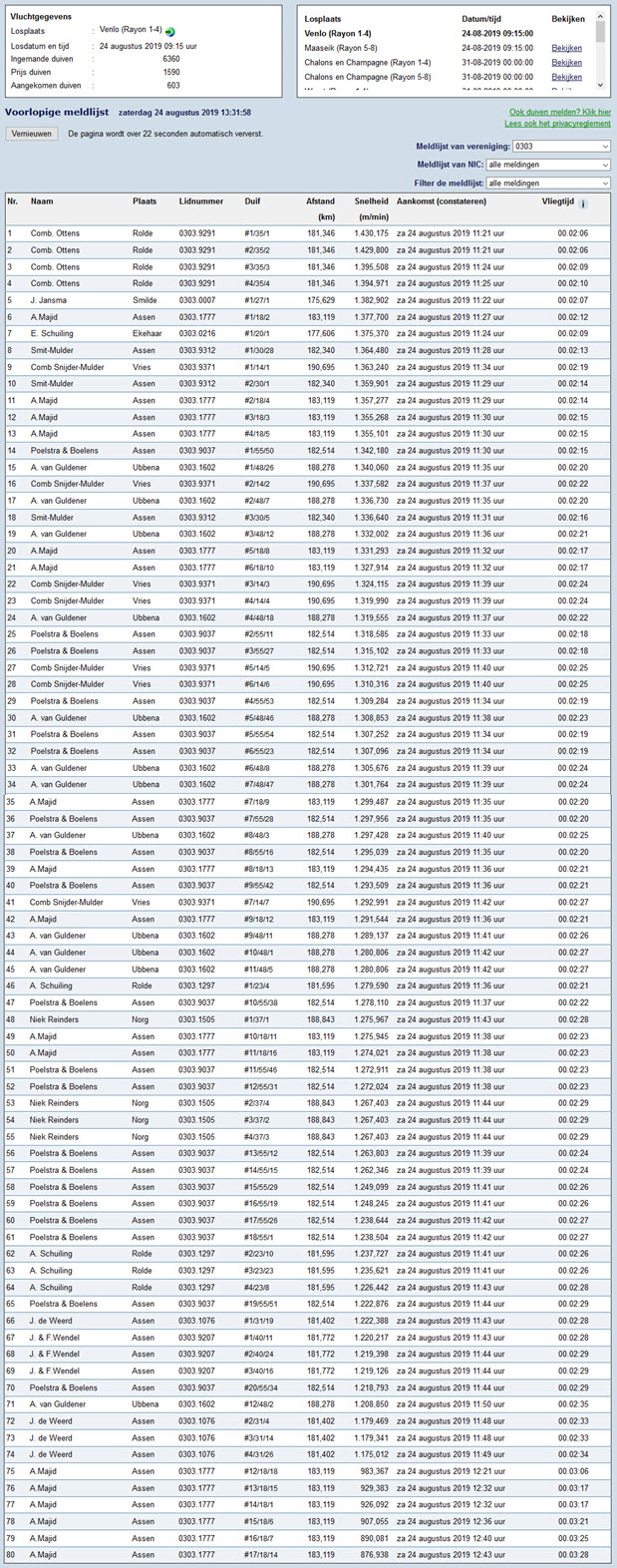 De 1e duif viel dus bij de Comb Ottens om 11.21.48 u met een snelheid van 1430,175 m/min. De laatste prijsduif viel om 11.44.05 u bij Bertus Dik